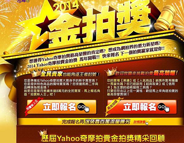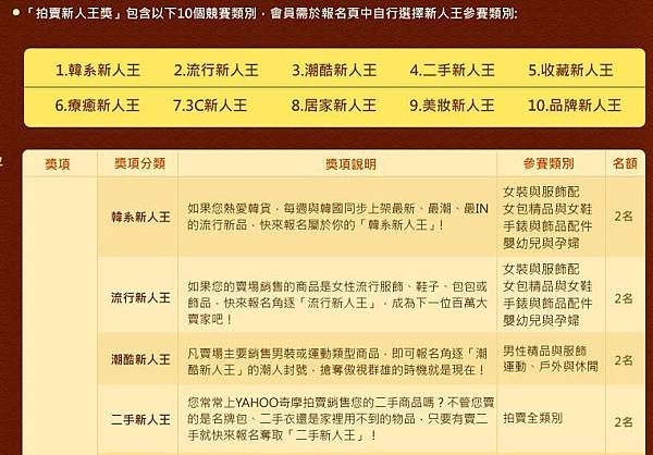 沒錯,就是標題閃亮亮的金拍獎!只要是大規模賣家,不論是新手或者老鳥都有適合角逐的獎項。Yahoo在舉辦這場網拍賣家寶座的規劃上十分貼心,特地為兩群不同背景的參賽者規劃不同競爭項目。