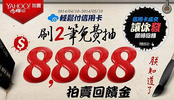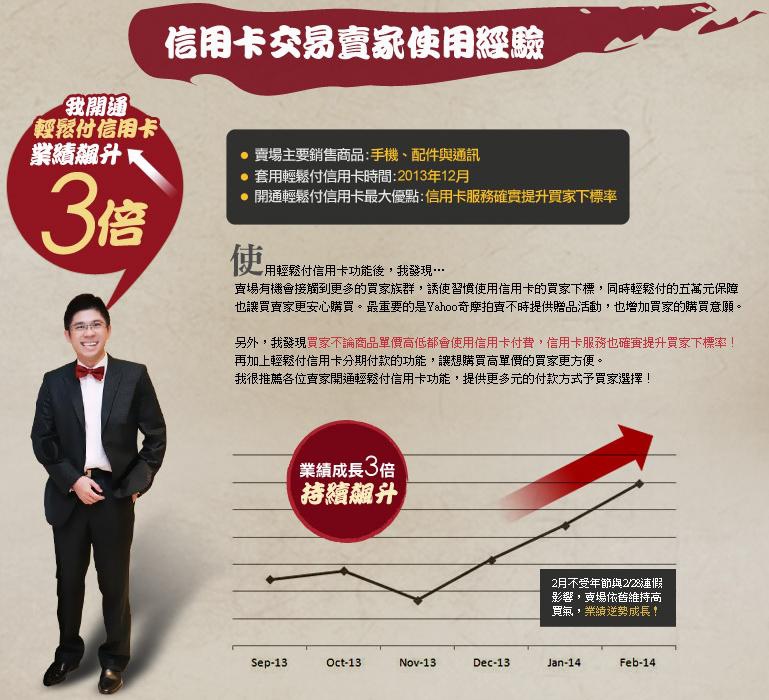 事實上,在信用卡成交機制方面,買家刷卡、賣家需要自行負擔手續費,因此願意開通的賣家數量較少,Yahoo有必要說服賣家為何要開通信用卡支付服務。在這邊Yahoo選擇了兩個方式來向賣家宣傳,可以從下面網宣當中推測: